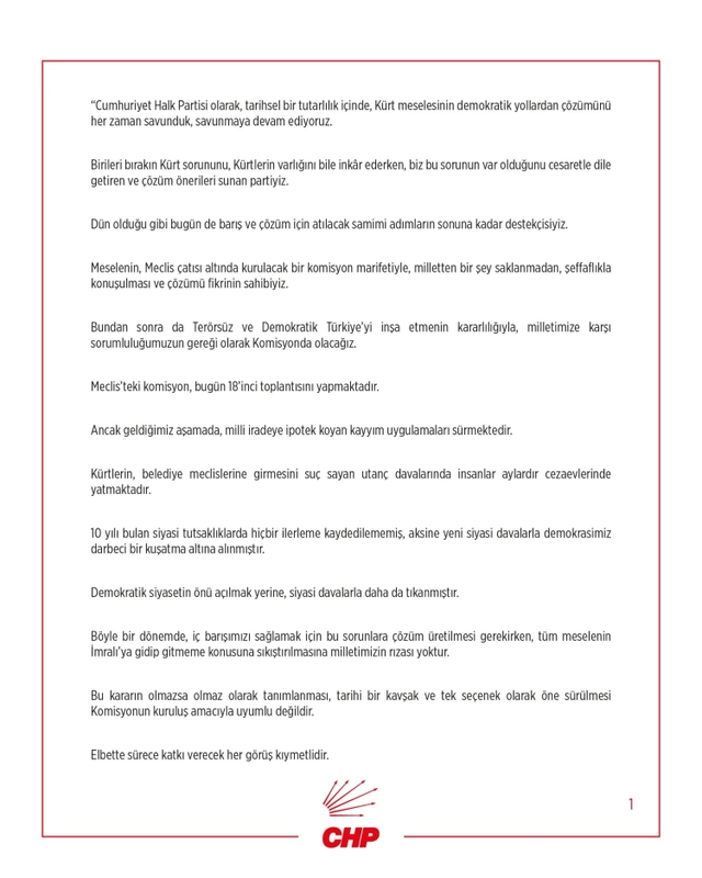 CHP, meselenin şeffaf biçimde Meclis çatısı altında ele alınması gerektiğini vurguladığ azılı açıklamada, "Partimiz bu ülkeye barışı da demokrasi ve adaleti de getirecek iradeye sahiptir!" denildi.