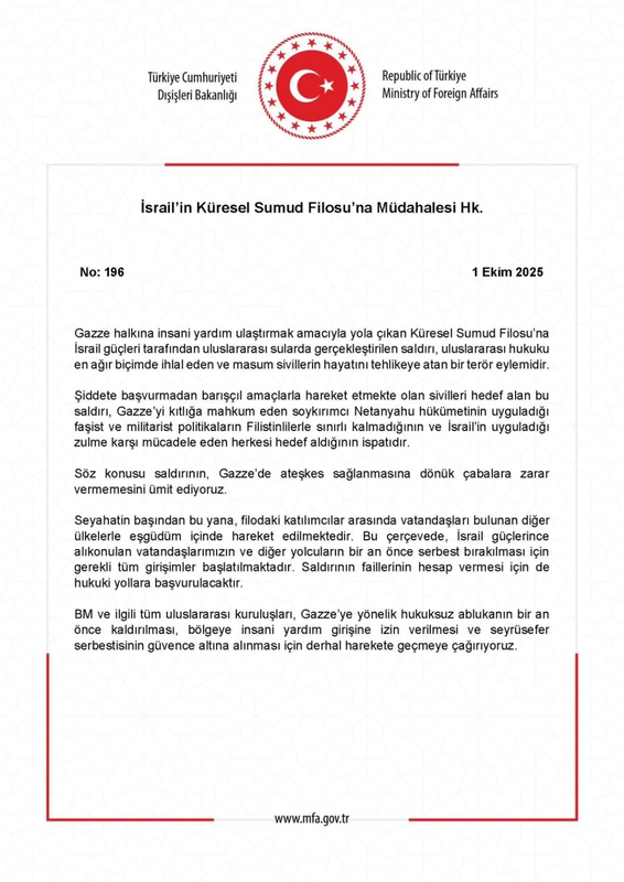Dışişleri Bakanlığı, Gazze'ye yardım taşıyan Küresel Sumud Filosu'na uluslararası sularda İsrail güçlerinin saldırısını kınadı. "Barışçıl sivilleri hedef alan bu faşist terör eylemi, Netanyahu'nun soykırım politikalarının kanıtı" denildi. Bakanlık, alıkonulan vatandaşların serbest bırakılması için girişim başlattı ve BM'yi ablukanın kaldırılmasına çağırdı.