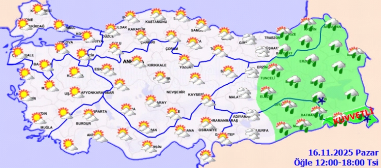Yağışların, Bitlis, Muş, Siirt, Şırnak ve Hakkari çevreleri ile Van'ın güneybatı kesimlerinde yer yer kuvvetli olacağı tahmin ediliyor. Sabah ve gece saatlerinde Marmara, İç Ege, Batı Akdeniz'in iç kesimleri, İç Anadolu'nun kuzeybatısı ile Batı ve Orta Karadeniz'in iç kesimlerinde yer yer pus ve sis bekleniyor.