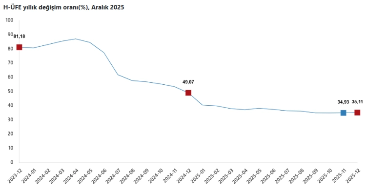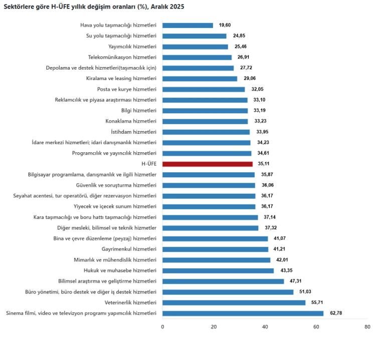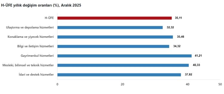 ANKARA (İGFA) - Türkiye İstatistik Kurumu'nun (TÜİK) verilerine göre, Hizmet Üretici Fiyat Endeksi (H-ÜFE) 2025 yılı Aralık ayında bir önceki aya göre yüzde 0,78, bir önceki yılın aynı ayına göre ise yüzde 35,11 artış gösterdi. On iki aylık ortalamalara göre artış oranı ise yüzde 36,78 oldu.