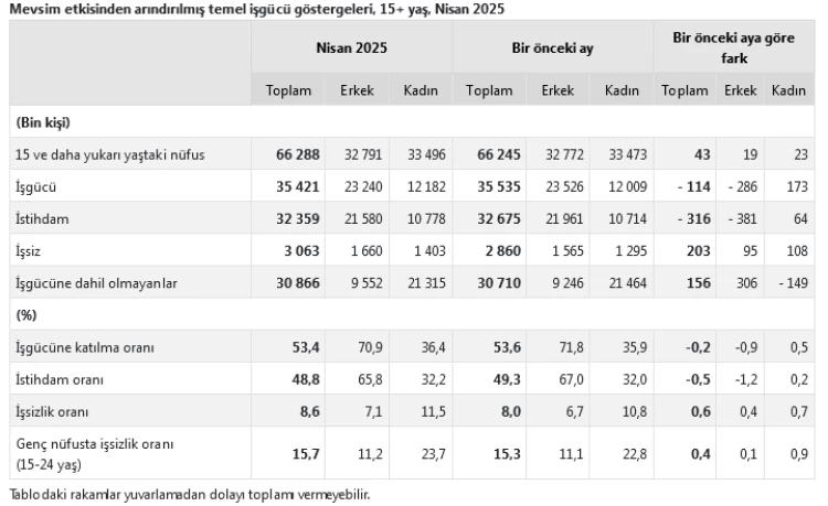 Türkiye'de mevsim etkisinden arındırılmış işsizlik oranı, Nisan 2025'te yüzde 8,6'ya ulaşırken, genç işsizlik yüzde 15,7 oldu. Atıl işgücü oranı yüzde 32,2'ye yükseldi