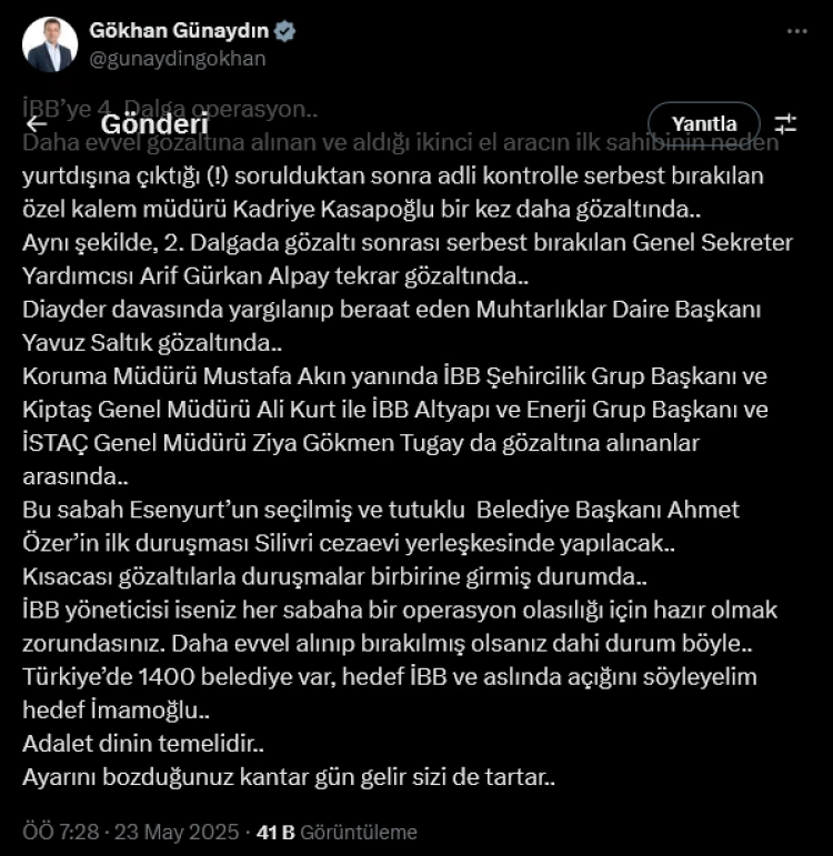 Günaydın paylaşımında, operasyon zamanının Esenyurt'un seçilmiş ve tutuklu Belediye Başkanı Ahmet Özer'in ilk duruşması Silivri Cezaevi yerleşkesinde yapılacak olmasına da atıfta bulunarak, gözaltılar ve duruşmaların iç içe geçtiğini söyledi.