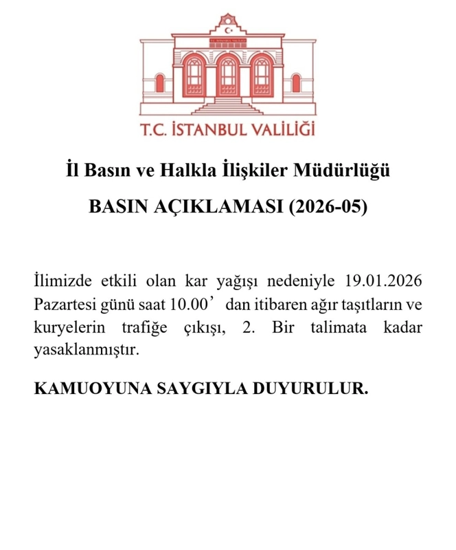İstanbul Valiliği, etkili olan kar yağışı nedeniyle 19 Ocak Pazartesi günü saat 10.00'dan itibaren ağır taşıtlar ve kuryelerin trafiğe çıkışını ikinci bir talimata kadar yasakladı.