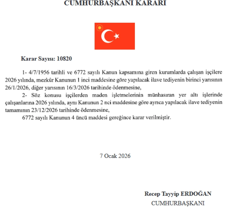 Cumhurbaşkanı Recep Tayyip Erdoğan'ın imzasıyla yayımlanan Resmi Gazete kararına göre, kamuda çalışan işçilerin 2026 yılı ilave tediye ödeme tarihleri açıklandı.