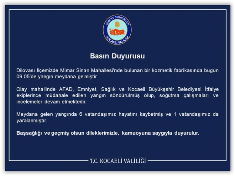 Kocaeli Valiliği tarafından yapılan açıklamada, yangında 6 kişinin hayatını kaybettiği, 1 kişinin ise yaralandığı bildirildi. Valilik açıklamasında, "Başsağlığı ve geçmiş olsun dileklerimizle, kamuoyuna saygıyla duyurulur" denildi.