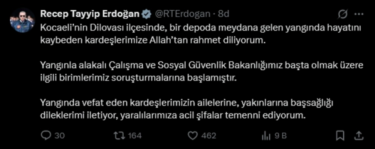 Cumhurbaşkanı Recep Tayyip Erdoğan da sosyal medya hesabından yaptığı paylaşımda, hayatını kaybedenler için Allah'tan rahmet dileyerek, yaralılara acil şifalar temenni etti. Erdoğan, "Yangınla alakalı Çalışma ve Sosyal Güvenlik Bakanlığımız başta olmak üzere ilgili birimlerimiz soruşturmalarına başlamıştır. Yangında vefat eden kardeşlerimizin ailelerine, yakınlarına başsağlığı dileklerimi iletiyorum" ifadelerini kullandı.
