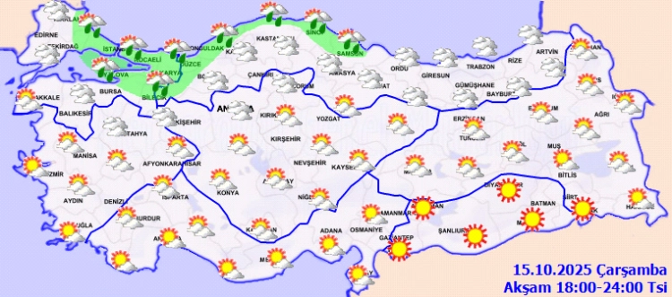 Meteoroloji Genel Müdürlüğü tarafından yapılan tahminlere göre: Ülkemizin kuzey, iç ve batı kesimlerinin parçalı ve çok bulutlu, Marmara'nın doğusu, Batı Karadeniz ve Samsun çevreleri ile Doğu Karadeniz'in iç kesimlerinin yüksek kesimlerinin yağmur ve sağanak yağışlı, diğer yerlerin az bulutlu ve açık geçeceği tahmin ediliyor.