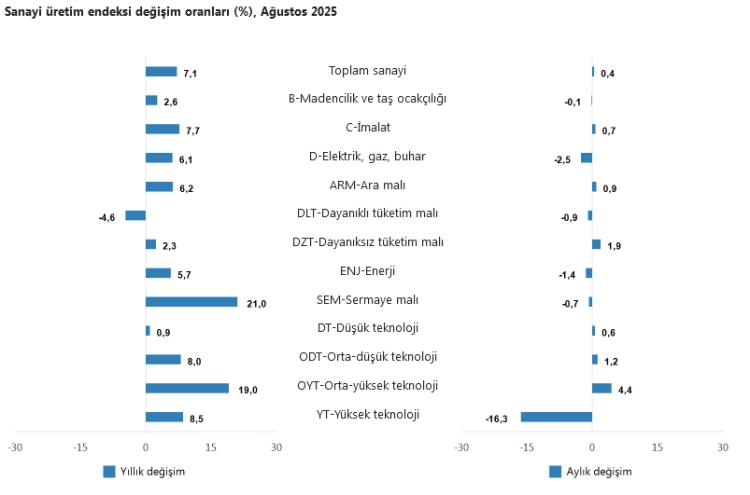 Türkiye İstatistik Kurumu (TÜİK), 2025 yılı Ağustos ayına ilişkin sanayi üretim endeksi verilerini açıkladı. Sanayi üretimi, takvim etkisinden arındırılmış verilere göre, bir önceki yılın aynı ayına göre yüzde 6,8 artarken, aylık bazda yüzde 0,4 artış gösterdi.