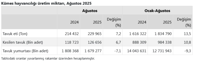 Türkiye İstatistik Kurumu (TÜİK) verilerine göre, Ocak-Ağustos 2025 döneminde tavuk eti üretimi bir önceki yılın aynı dönemine göre yüzde13,5 artışla 229 bin 965 tona yükseldi. Ancak tavuk yumurtası üretimi yüzde 9,3 geriledi. Ağustos ayında ise yumurta üretimi yüzde 7,1 azalırken, tavuk eti yüzde 7,2 artmıştı.