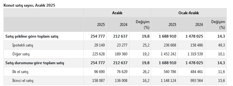 TÜİK verilerine göre Türkiye genelinde konut satışları 2025 yılında artışını sürdürdü. Aralık ayında ise satışlar yüzde 19,8 yükselerek 254 bin 777'ye ulaştı. Veriler, 2025 yılında konut piyasasında satışların genel olarak canlandığını, özellikle ipotekli ve ilk el satışlarda belirgin artış yaşandığı istatistiki tablolara yansıdı.