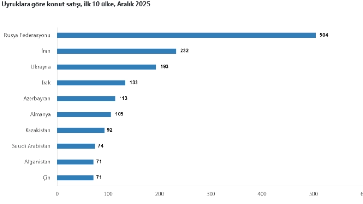 Ülke uyruklarına göre 2025 yılında en fazla konut satışı; 3 bin 649 ile Rusya Federasyonu, 1.878 ile İran, 1.541 ile Ukrayna vatandaşlarına yapıldı. Aralık ayında da aynı sıralama korunurken, Rusya Federasyonu vatandaşları 504 konut ile ilk sırada yer aldı.