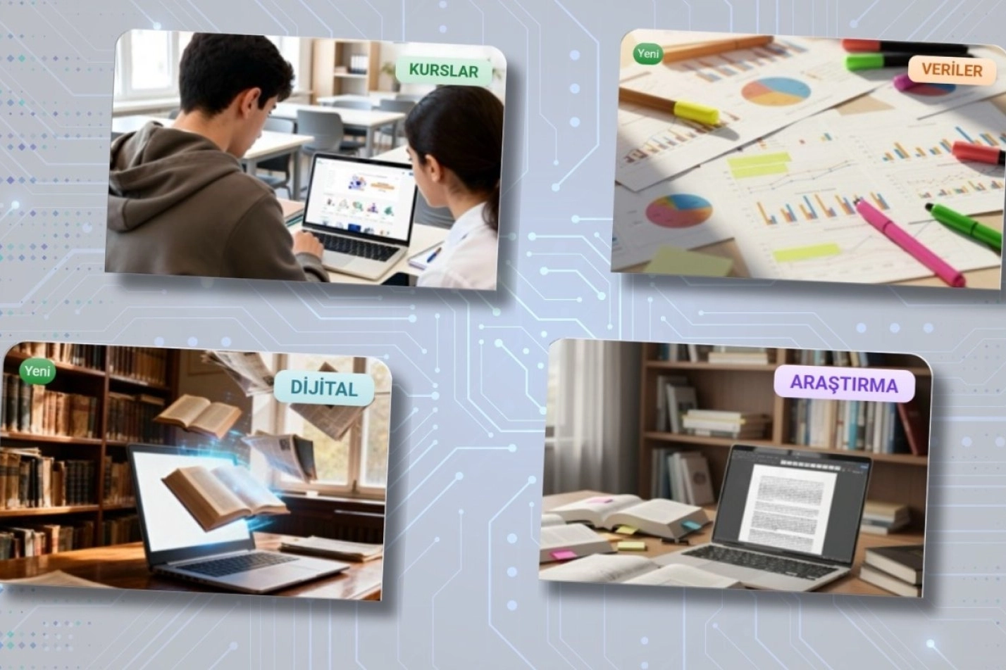 Akademik araştırma siteleri bölümünde fen bilimleri ve sosyal bilimler alanlarında gerçekleştirdikleri çalışma ve projeler için faydalı linkleri ziyaret edebilecek olan kullanıcılar, istatistiki verilere ihtiyaç duydukları anda yerli ve yabancı 8 portalın yer aldığı istatistiki veri kanalları bölümünden ulaşabilecek. 4 faydalı linkin yer aldığı çevrim içi kurslar bölümü sayesinde eğitim, teknoloji, kültür, hukuk, siyaset gibi alanlarda yer verilen kurslara katılmak mümkün olacak.
