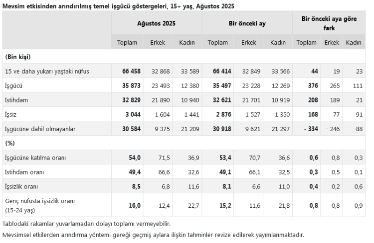TÜİK'in Hanehalkı İşgücü Araştırması'na göre, Ağustos 2025'te mevsim etkisinden arındırılmış işsizlik oranı 0,4 puan artarak yüzde 8,5'e çıktı. İstihdam oranı yüzde 49,4, işgücüne katılma oranı yüzde 54,0 olarak kaydedildi. Genç işsizlik yüzde 16,0'a yükselirken, haftalık fiili çalışma süresi 41,8 saate geriledi.