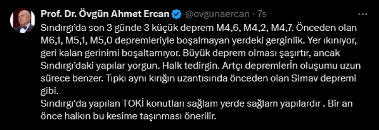 Prof. Dr. Övgün Ahmet Ercan, Balıkesir Sındırgı'da son 3 günde M4,6, M4,2 ve M4,7 büyüklüğündeki depremlerin, önceki M6,1, M5,1 ve M5,0 sarsıntılarıyla boşalmayan gerginliği gösterdiğini belirtti. "Büyük deprem şaşırtır ama yapılar yorgun, halk tedirgin. Artçılar uzun sürecek," diyerek TOKİ konutlarına taşınmayı önerdi.