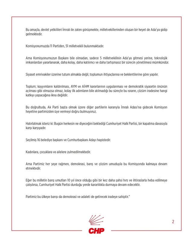 CHP, toplumun beklentisinin bu sorunların çözümü olduğunu belirterek, "Tüm mesele İmralı'ya gidip gitmeme tartışmasına sıkıştırılmak isteniyor. Bu kararın olmazsa olmaz olarak sunulmasına milletimizin rızası yoktur." dedi. Yazılı açıklamada, yalnızca birkaç milletvekilinin İmralı'ya gönderilmesi yerine daha katılımcı ve teknolojik yöntemlerle sürecin yürütülebileceğini savundu.