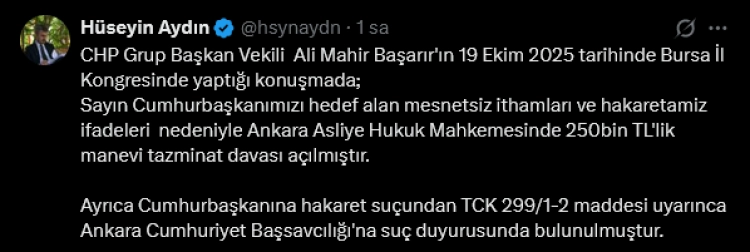 CHP Grup Başkanvekili Ali Mahir Başarır'ın Bursa İl Kongresi'nde yaptığı konuşmada Cumhurbaşkanı Recep Tayyip Erdoğan'a yönelik ifadeleri nedeniyle, hem manevi tazminat davası açıldı hem de savcılığa suç duyurusunda bulunuldu.