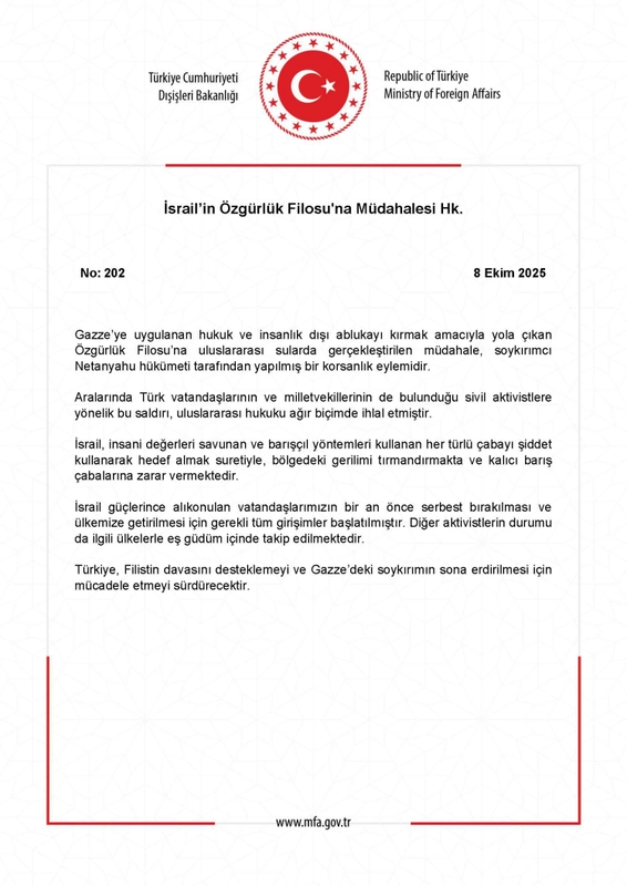 Dışişleri Bakanlığı, Gazze ablukasını kırmak için yola çıkan Özgürlük Filosu'na uluslararası sularda İsrail'in müdahalesini "korsanlık eylemi" olarak niteledi. Türk vatandaşları ve milletvekillerinin de bulunduğu aktivistlerin alıkonulduğunu belirten Bakanlık, serbest bırakılmaları için girişimlere başladı.