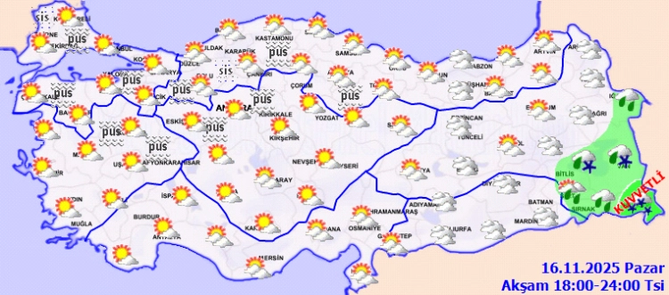 Yağışların, Bitlis, Muş, Siirt, Şırnak ve Hakkari çevreleri ile Van'ın güneybatı kesimlerinde yer yer kuvvetli olacağı tahmin ediliyor. Sabah ve gece saatlerinde Marmara, İç Ege, Batı Akdeniz'in iç kesimleri, İç Anadolu'nun kuzeybatısı ile Batı ve Orta Karadeniz'in iç kesimlerinde yer yer pus ve sis bekleniyor.