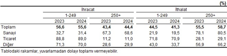Verilere göre, 179 bin 673 girişim ihracat, 318 bin 603 girişim ithalat yaptı. Eşleştirmede girişimlerin yüzde 100'üne ulaşıldı; ithalattaki girişim artışı, Basitleştirilmiş Gümrük Beyannamesi sisteminden kaynaklandı.Girişim Ölçeklerine Göre Dağılım İhracat: Mikro (1-9 çalışan) girişimler yüzde 75,6'sını oluşturup yüzde 18,8 pay aldı. Küçük (10-49) yüzde 17,5, orta (50-249) yüzde 19,2, büyük (250+) yüzde 44,4 paya sahip.