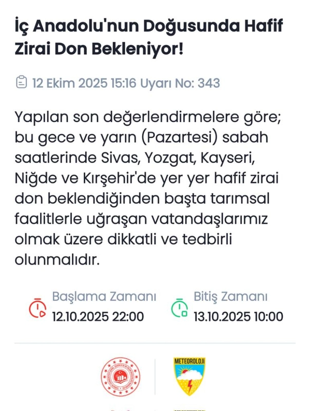 Meteoroloji Genel Müdürlüğü (MGM), Sivas, Yozgat, Kayseri, Niğde ve Kırşehir'de yer yer hafif zirai don oluşabileceği uyarısında bulunularak, tarımsal faaliyetlerle uğraşan vatandaşların dikkatli ve tedbirli olması istendi.