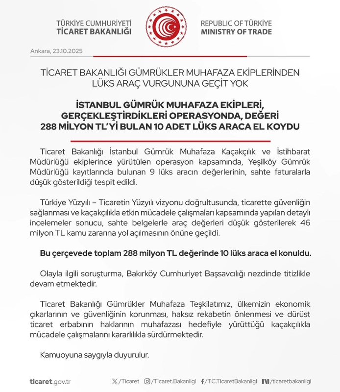Ticaret Bakanlığı'na bağlı Gümrük Muhafaza ekipleri, Yeşilköy Gümrük Müdürlüğü kayıtlarında yürütülen operasyon kapsamında, sahte faturalarla değerleri düşük gösterilen 288 milyon TL değerindeki 10 lüks araca el koydu. Operasyonla 46 milyon TL kamu zararı önlendi.