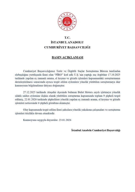 Başsavcılık tarafından yapılan açıklamada, örgüte yönelik 17 Ekim 2025 tarihinde gerçekleştirilen eş zamanlı arama, el koyma ve gözaltı işlemlerinin ardından tespit edilen yeni eylemler doğrultusunda soruşturmanın derinleştirildiği belirtildi. Bu kapsamda, 27 Aralık 2025 tarihinde Ataşehir ilçesinde Bulut Motors isimli iş yerine yönelik düzenlenen silahlı saldırı olayıyla bağlantılı olarak toplam 9 şüpheli tespit edildi. Şüphelilere yönelik 22 Ocak 2026 tarihinde düzenlenen eş zamanlı operasyonlarda 6 kişi gözaltına alındı.