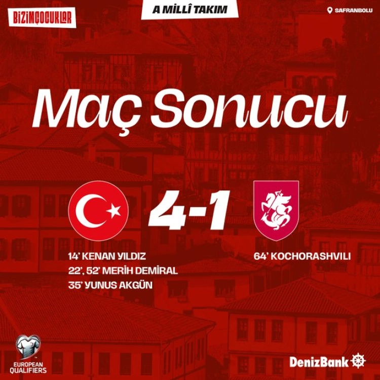 Kocaeli'de oynanan maçta A Millî Futbol Takımımız, rakibini mağlup ederek büyük bir zafer elde etti. FIFA 2026 Dünya Kupası Avrupa Elemeleri E Grubu 4'üncü maçında Gürcistan'ı 4-1 mağlup ederek , puanını 9'a yükseltti.