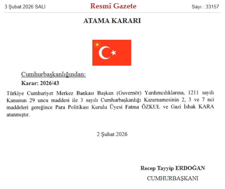 Buna göre Para Politikası Kurulu Üyesi Fatma Özkul ile Gazi İshak Kara, Merkez Bankası Başkan Yardımcılıklarına atandı.