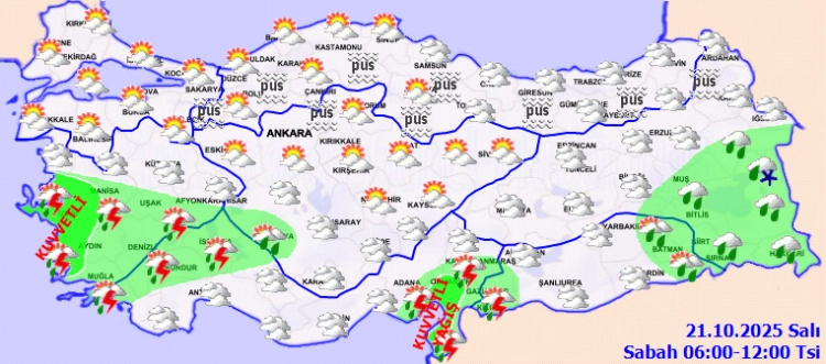 Özellikle Kıyı Ege, Osmaniye, Hatay kıyıları, Bitlis, Şırnak ve Siirt çevreleri ile Van ve Hakkari'nin batı ilçelerinde yerel olarak kuvvetli sağanak yağışlar beklenirken, hava sıcaklıklarının mevsim normalleri civarında seyretmesi beklendiği, rüzgarın da genellikle güney ve doğu yönlerden hafif, zaman zaman orta kuvvette eseceği tahmin edildi.
