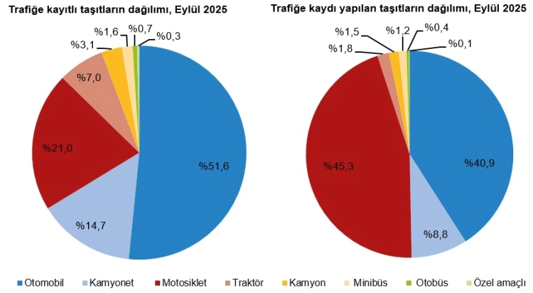 Eylül 2024'e göre karşılaştırıldığında, trafiğe kayıtlı yeni taşıt sayısında yüzde 7,6'lık bir azalma görüldü. Yıllık bazda en fazla artış, özel amaçlı taşıtlarda (yüzde 77,5) gerçekleşirken, traktör (-yüzde 43,1) ve motosiklet (-yüzde 26,4) kayıtlarında sert düşüşler yaşandı.