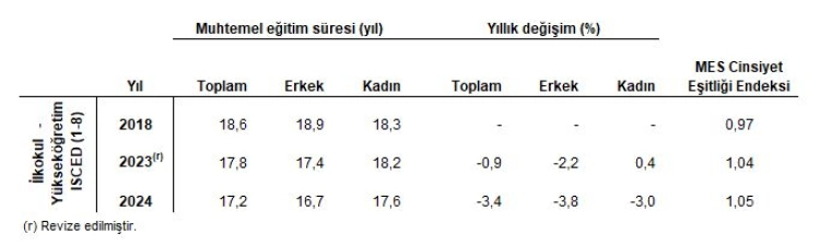ANKARA (İGFA) - Türkiye İstatistik Kurumu (TÜİK), 2024 Muhtemel Eğitim Süresi (MES) verilerini yayımladı.