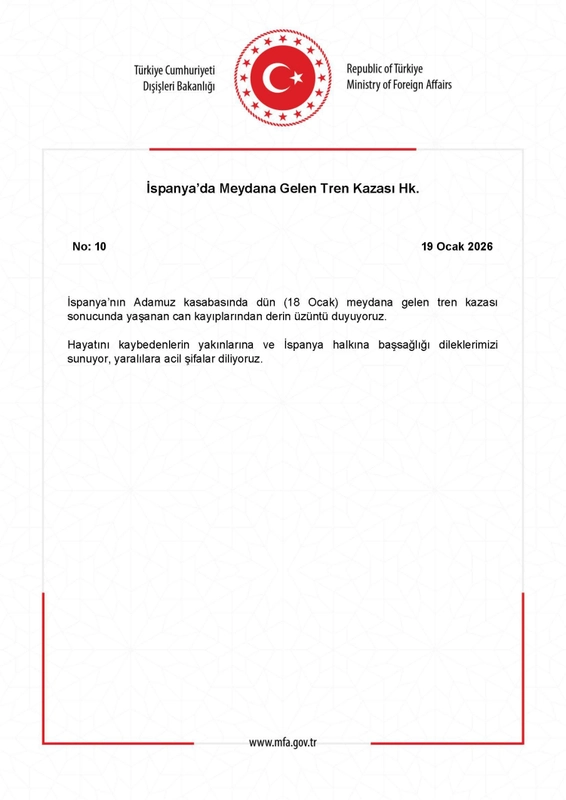 Dışişleri Bakanlığı, İspanya'nın Adamuz kasabasında meydana gelen tren kazasında hayatını kaybedenler için taziye mesajı yayımladı.
