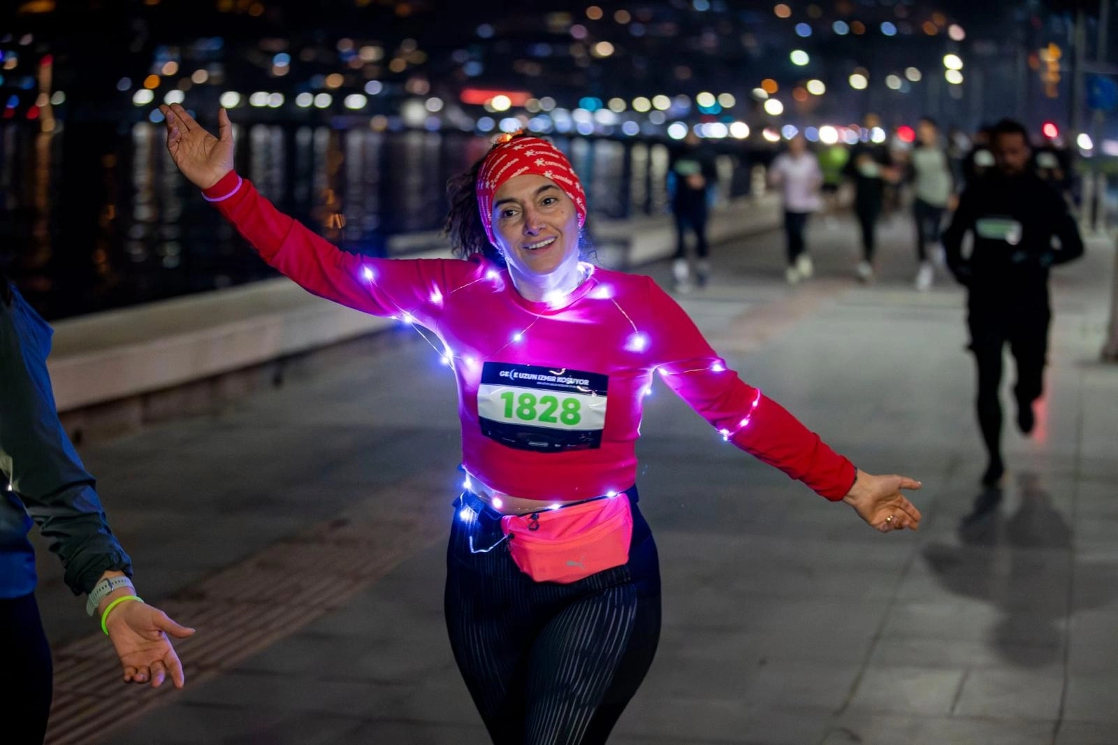 Katılımcılar geceyi aydınlatan koşu öncesinde Saat Kulesi önünde ısındı, start ise 21.12’de Konak Vapur İskelesi önünden verildi. İzmirliler, vücutlarına sardıkları ışıklar, ışıklı şapkalar ve kostümlerle geceyi aydınlattı. Mustafa Kemal Sahil Bulvarı paralelindeki bisiklet ve yürüyüş yolu üzerinden yapılan etkinlik, İnciraltı Kent Ormanı Engelliler Parkı’nda sona erdi.